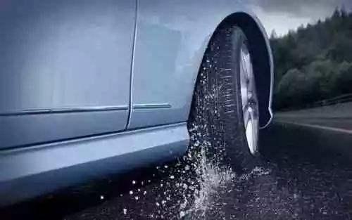 下雨天由于轮胎表面的花纹空隙被路面的雨水填满而变得光滑,雨水来不及被轮胎排出时在轮胎下聚拢形成楔形。随着车速的加快,楔形的厚度逐渐增加,轮胎与路面的接触面积减小,附着地面的系数急剧下降,最终使得轮胎与路面接触完全脱离,形成水膜。