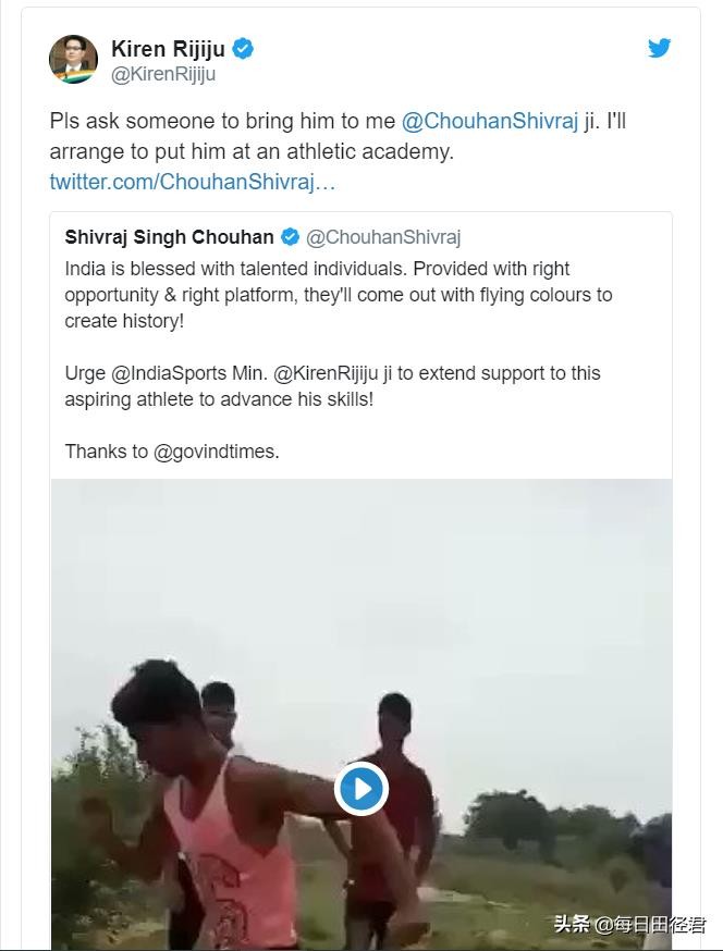 (文/田径君)北京时间8月18日上午,印度一位名叫拉姆什瓦尔·古贾尔的19岁青年赤脚百米冲刺进11秒的视频,在国内外媒体传播开来,古贾尔表示如果政府给他提供训练保障,他将会夺得世界大赛百米奖牌,并打破博尔特9秒58世界纪录,印度体育部长Kiren Rijiju迅速作出反应,将安排这名19岁的年轻人进入印度国家田径学院。