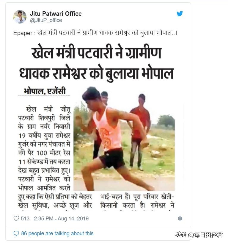 一个19岁青年百米成绩在11秒30左右,很有短跑运动天赋吗?其实这在田径界属于一般般的成绩,放在中国许多教练都不会收古贾尔为队员,然而印度体育部门如获至宝,前印度中央邦首席部长Shivraj Singh Chouhan赞誉古贾尔道:“ 印度人才很有天赋,要提供合适的机会和正确的平台,古贾尔将以绚丽的色彩创造历史!”并敦促现任体育部长Kiren Rijiju向这位有抱负的运动员提供一切援助保证!