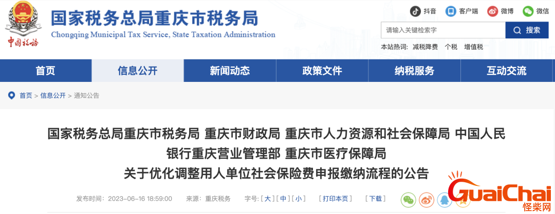 6月16号,重庆市税务局、财政局、人社局也联合发布了《关于优化调整用人单位社会保险费申报缴纳流程的公告》。