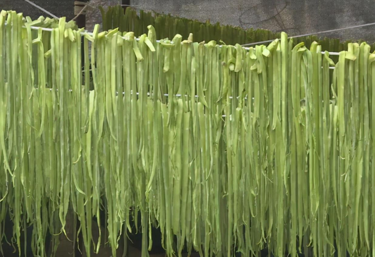 新鲜的贡菜收割回来,清洗干净了,就要把它们切割成为粗细均匀的长条,然后挂在外面晾晒。