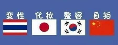 泰国变性手术,韩国整形,日本化妆,中国美颜(其实很多人说是ps,我觉得这个是片面的,美颜技术其实有很多,ps是其中一个,中国人用得更多的是美图秀秀)。