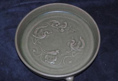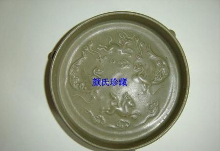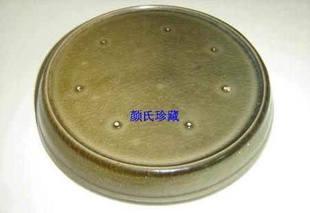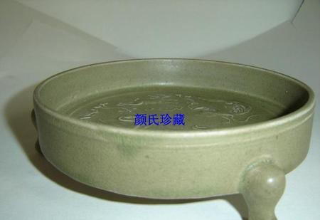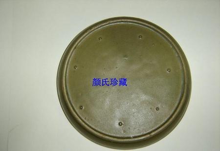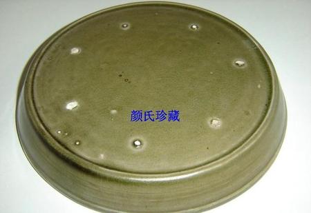 北宋中早期汝窑翠青釉花鸟纹五小圆支钉三足洗。与正数第三个浅圈足洗为同一图谱。