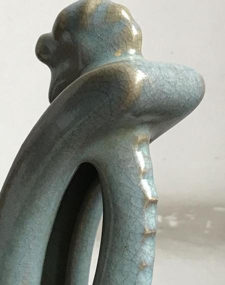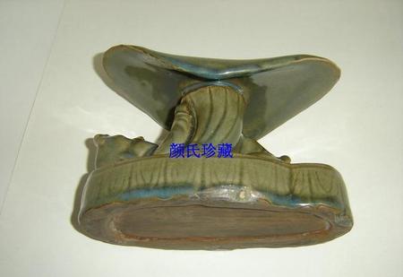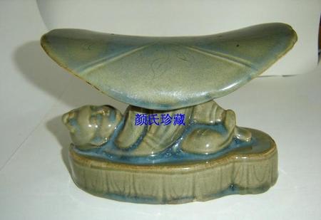 北宋中早期汝窑翡翠釉金童执荷孩儿枕。整件器物构思绝妙,趣味无穷,捏塑、堆塑、阳雕、阴刻无所不用其极,精妙绝伦,鬼斧神工,浑然天成,令人美不胜收、爱不释手。