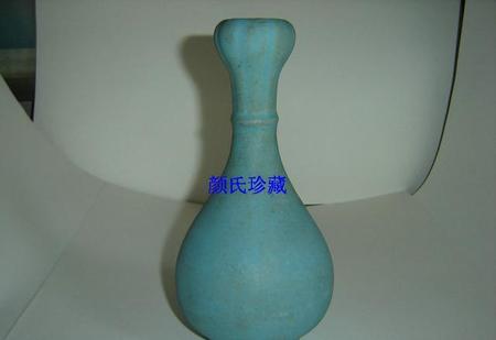 北宋汝窑鼎盛期天蓝釉弦纹蒜头瓶。
