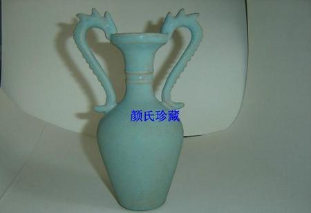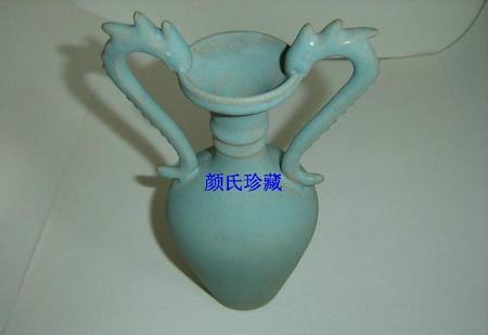 北宋汝窑鼎盛期天蓝釉弦纹双龙衔口瓶。