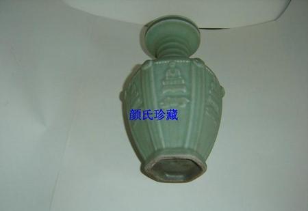 北宋早期汝窑梅子青釉阳雕弦纹人面瑞兽佛像盘口六方双系瓶。梅子青釉发色翠绿醇厚,正视如玉,侧视如绒,六面浮雕下瑞兽上坐佛纹饰,端庄典雅,清新生动;间隔浮雕上人面下三条阳线,暗喻三界苍生;肩颈浮雕莲瓣纹,暗喻佛光普照、净化众生;弦纹等距凹凸,若隐若现、若有若无、飘逸玄妙;盘口清丽端庄,双系清秀俊逸。整件器物,通体一色,欺冰赛玉,似玉非玉胜于玉,令人叹为观止、心驰神往、爱不释手。