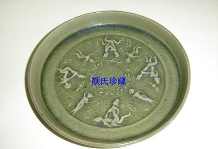 北宋中早期汝窑翠青釉减地阳雕春宫图七圆支钉浅圈足笔洗。“春宫图”为宫廷秘籍,捉刀代笔,更显立体趣味,线条精美,构图丰腴,动静相间,妙趣无穷。