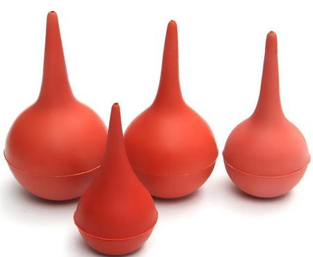 •拿起一个球形洗鼻器(球泵式吸鼻器,见图示,可从当地药店购买)并挤出所有空气。将窄端放入盐水溶液中并释放球顶以将盐水吸入灯泡中。