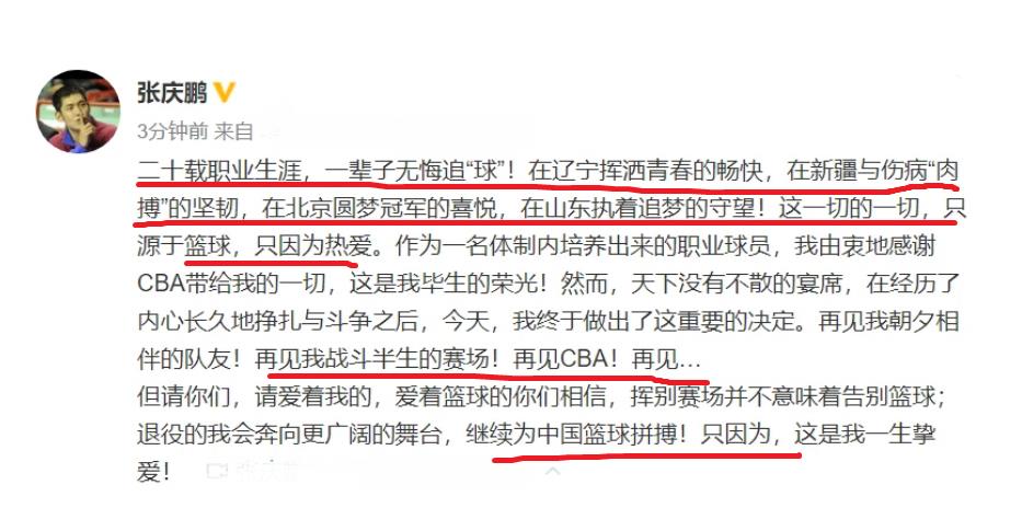 今年这个夏天,山东队没有给39岁的张庆鹏一份新合同,这也意味着张庆鹏很有可能就此告别CBA,随着时间的推移,也没有关于张庆鹏签约其他球队的消息。在刚刚,张庆鹏通过个人网络平台正式宣布退役的消息,结束了他20年的职业生涯。张庆鹏是这样写道,“二十载职业生涯,一辈子无悔追‘球’!在辽宁挥洒青春的畅快,在新疆与伤病‘肉搏’的坚韧,在北京圆梦冠军的喜悦,在山东执着追梦的守望!这一切的一切,只源于篮球,只因为热爱。”