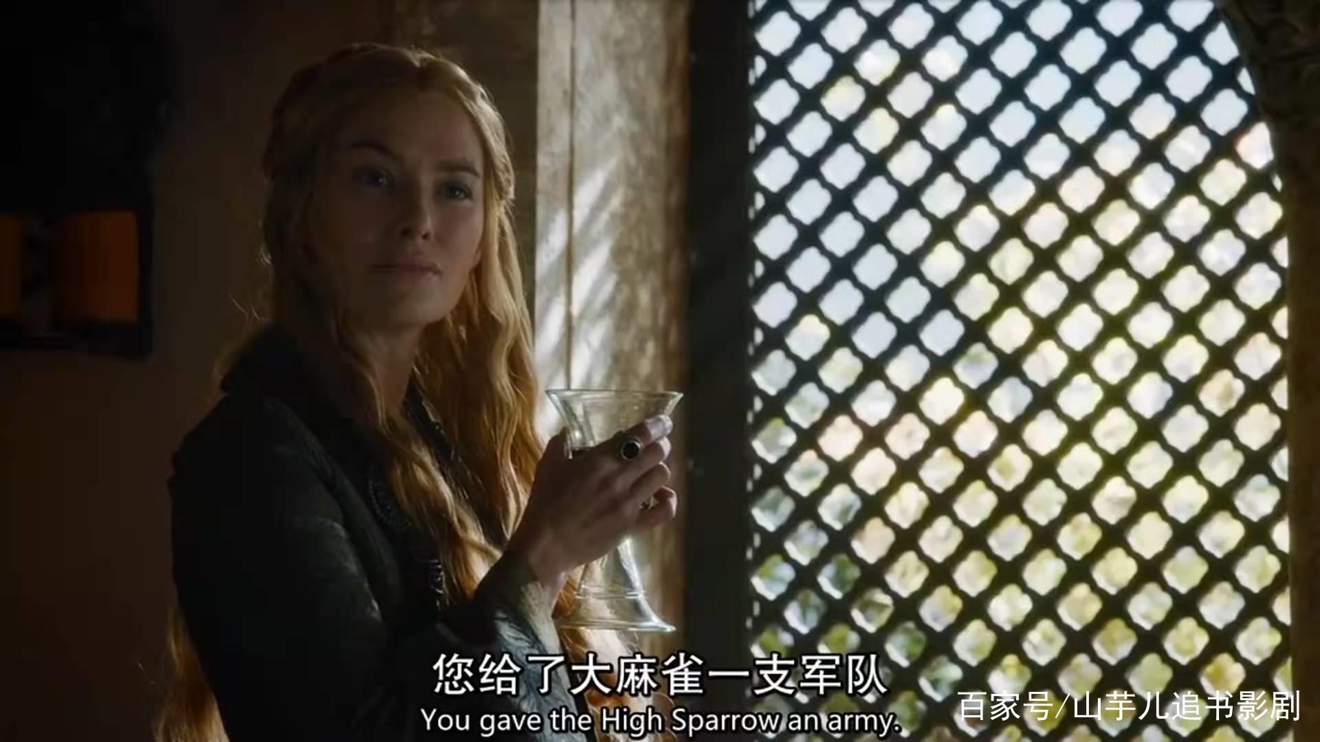 瑟曦为了打击提利尔家族,给了宗教领袖大麻雀武装力量,抓走了提利尔家族继承人洛拉斯和替哥哥作伪证的王后“小玫瑰”,玩砸了的瑟曦自己也被迫剃光头发裸身游街赎罪。