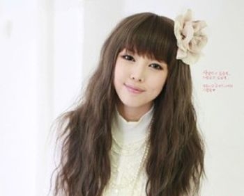 长脸的女孩子想要将长脸变短脸,齐刘海的长发麦穗烫就轻松的为你达到理想的效果来,刘海很好的遮住了脸型的比例,而蓬松的烫发更是时尚和显小清新风的呢,搭配上一个花朵装点,很是有森系女孩的感觉呢。