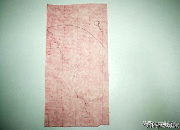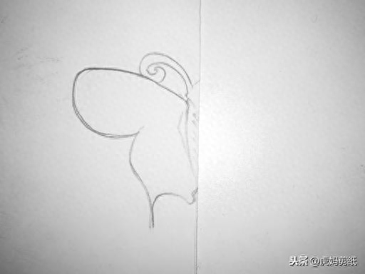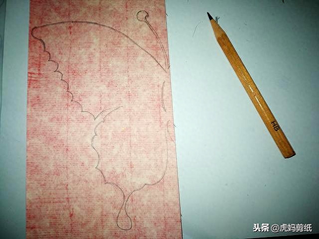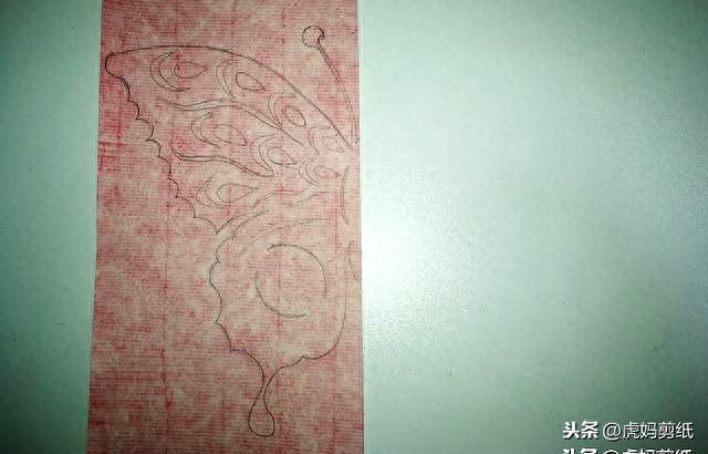 下面,虎妈详细的讲一下蝴蝶剪纸的步骤,纸张对折后画上底稿,如图。