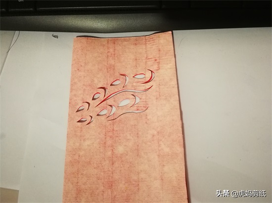 剪水滴纹的时候我们先在中间扎一个小孔,然后向边缘移动,慢慢剪出水滴的形状。注意固定好剪刀的位置,转动纸张。因为并不是脱稿剪纸,所以在剪得过程中没有什么难度,大家仔细一点就行。