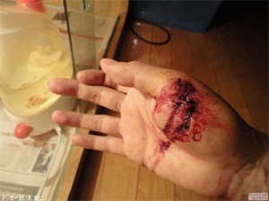 大概下午四点,我给蛇类饲养箱安装玻璃推拉门,此时发现上午被咬处又开始缓慢出血,当时没在意,以为是动手干活把伤口拉破,简单处理了下,可这时左手中指肚不慎被玻璃划伤,流血不止,用卫生纸按住半小时,往复数次,可是每当拿下卫生纸时仍然血流如注,怎么处理都没有用,当时很奇怪,因为以前我受伤都是很快能止住血。而此时右手被咬处伤口流血症状也加剧,也是开始止不住了。直到晚上大概八点钟,左右玻璃划伤伤口仍然大量流血,丝毫没有减弱的意思,右手蛇伤伤口仍缓慢流血,肿胀症状也加剧,最后无奈道医院花十块钱上药包扎一下受伤的伤口,这才止住流血。