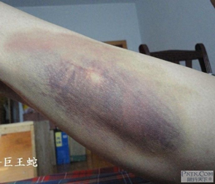 被咬后的第二天,早上起来下地突然觉得右大腿内侧疼痛,一看发现一块拳头大小的瘀伤,3至4天后,瘀伤蔓延至整个大腿内侧,大概一周后慢慢消散,
