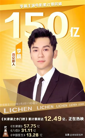 然后是李晨。作为80后男演员的代表,李晨的演技挑不出毛病。但他晋级“百亿影星”前十强,总给人感觉差点意思。原因很简单,李晨入列“百亿影人”的几部关键作品,《长津湖》《长津湖之水门桥》《八佰》票房累计超120亿元,但李晨仅是参演演员,并非主角。