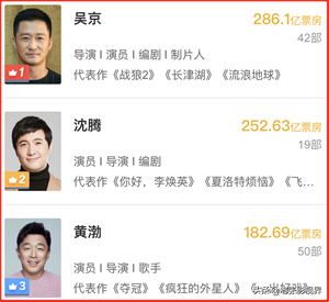 从票房成绩来看,冠军是吴京,个人票房累计286.1亿元,其次是沈腾,个人票房累计252.63亿元,黄渤排名第三位,个人票房累计182.69亿元。