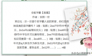 某论坛:扒一扒那个卖学霸人设的某星,你们觉得她是真的是学霸吗? 1楼:贴图(2oo7年f市中考状元,2o1o年z省理科状元) 2楼:贴图(2oo6年获得f市中学生作文比赛特等奖,2oo7年获得z省全科知识竞赛第一名,2oo8年……) 3楼:贴图(2o11年代表q大新生作为新生代表,2o11年代表q大参加国家竞赛,拿到金奖,2o12年……) …… n楼