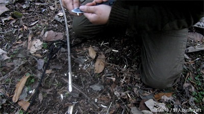 然后再找一根小树枝,长度约20厘米,一端削到跟刚才挖的小孔差不多的大小,稍微比刚才挖的小孔大点就可以,然后头部削成45度倒角形状