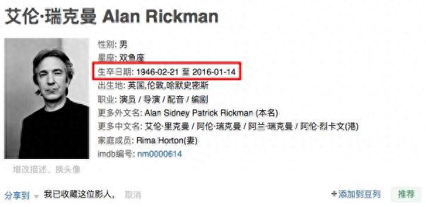 艾伦·瑞克曼曾出演过《哈利·波特系列》《真爱至上》《香水》《午宴之歌》《理智与情感》《理发师陶德》《银河系漫游指南》《虎胆龙威》等影片,因扮演《哈利·波特》中的斯内普教授而深入人心。