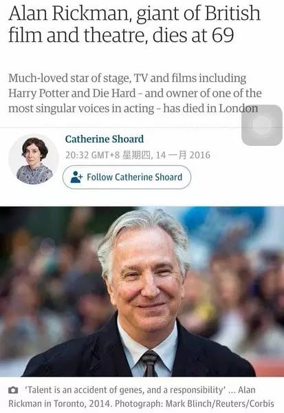 前几天大卫·鲍伊才离开我们,今天斯内普也走了,也是癌症,也是69岁,只是还没有等到最后一个生日,不敢相信这是真的。