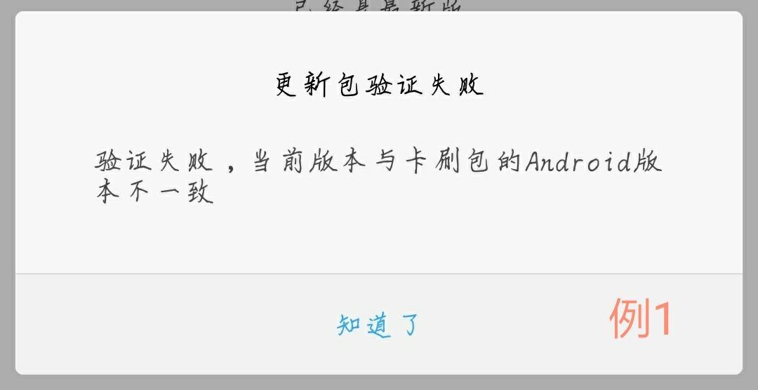 例1:当升级出现“验证失败,当前版本与卡刷包的Android版本不一致”时 你就要注意你的安卓版本是不是6.0的了 6.0版本必须要用6.0版本的miui8开发版才能卡刷, 卡刷完以后必须再次更新 再次更新后就是miui9了(部分机型需要更新两遍)