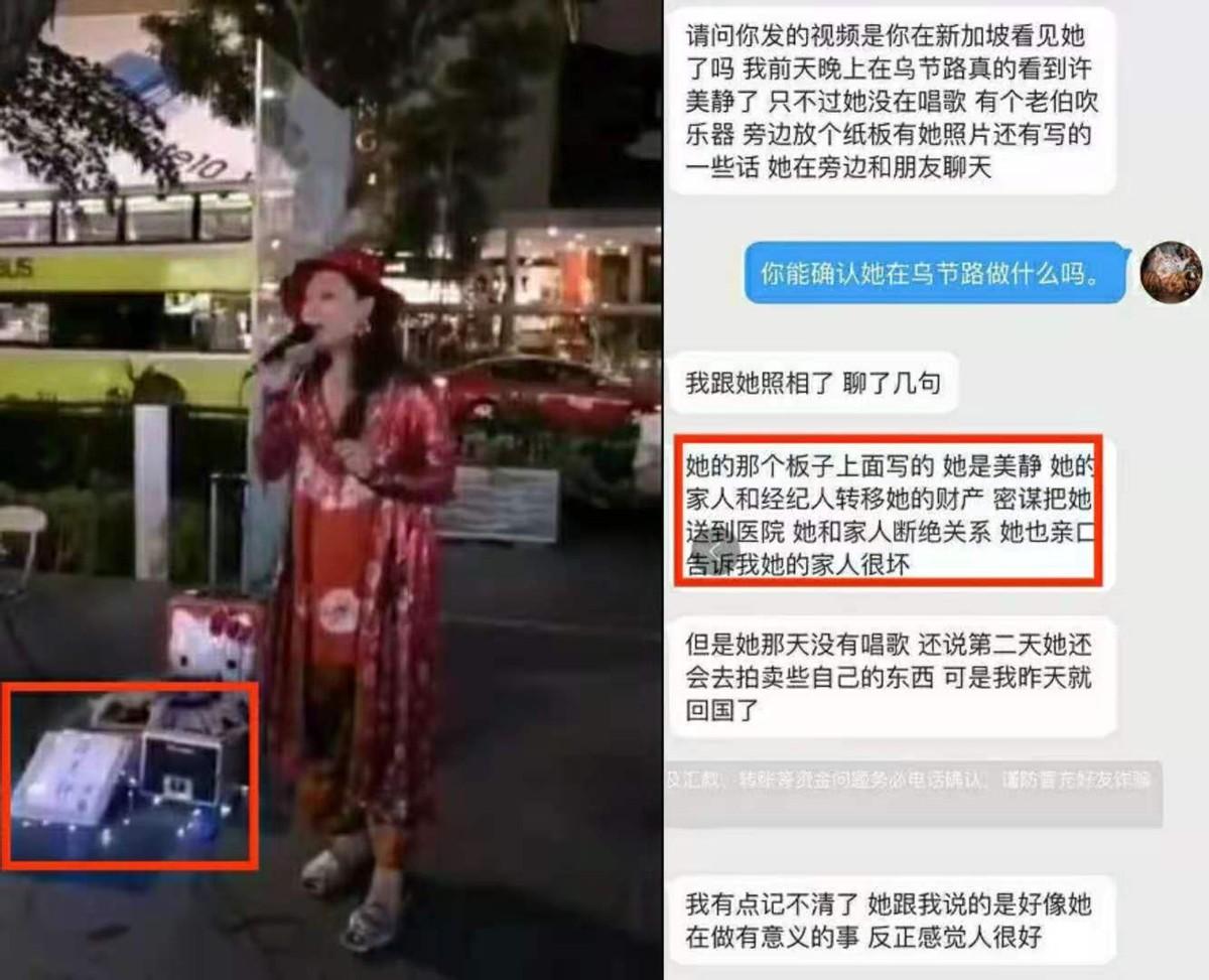 失去了感情和金钱的许美静,被网友偶遇在街头卖唱。有人将视频放在了网上,可以看出画面中许美静身材已经走样,并且还放了一块板子,上面写着自己的名字,并且控诉家人和经纪人密谋转移她财产的恶行。