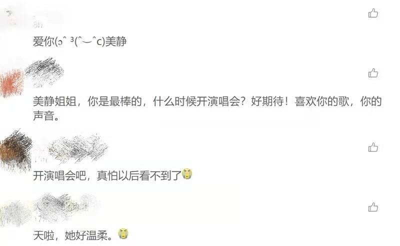 评论里的网友也纷纷与偶像热情互动 ,向她表白 ,“喜欢你的歌,你的声音”。也有人表示期待她的演唱会,称“真怕以后看不到了”。