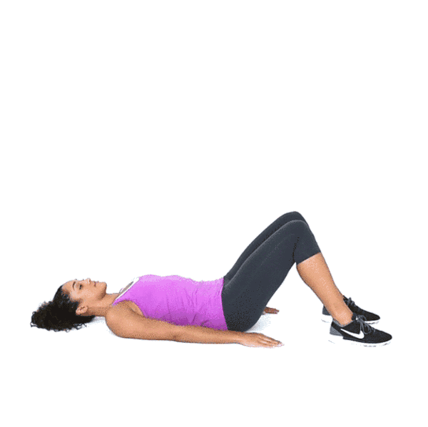 仰面平躺在瑜伽垫上,双腿打开保持弯曲,脚跟靠近臀部,然后开始吸气;双手撑住腰,双腿保持打开的状态,吸气,然后弯曲双腿使用臀部的力量让身体离开地面,使身体呈现个拱形,保持10s,连续进行6次;
