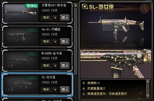 虽然Scar light很早之前就存在穿越火线游戏中,可它一直被M4a1碾压,伤害与射速都略低一点。可或许正是因为这样,在星座武器中,SL-处女座拥有三项属性加成,“装弹数量+3”、“武器重量减少”以及“换弹速度提升、切换速度提升”,并且价格相比其它星座武器也要便宜,仅需15800CF点就可购买永久。