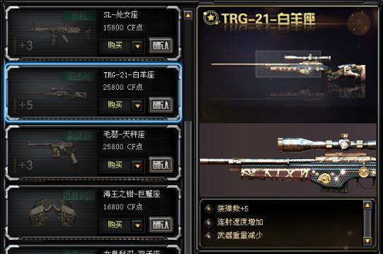面对现在狙击枪盛行的年代,几乎玩家所持的都是巴雷特系列武器,就连天龙都比较少出现了。而TRG-21-白羊座虽说地位较低,但它弥补了狙击枪的一些缺陷“装弹数+5”、“连射速度增加”、“武器重量减少”,这能让你即便手持狙击枪,也能够快速移动,特别适合那些喜欢瞬狙的玩家。
