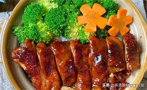 2:锅里水开放西蓝花和胡萝卜焯水2分钟捞出。适量油把鸡排煎至两面金黄,倒入照烧汁小火焖5分钟左右。