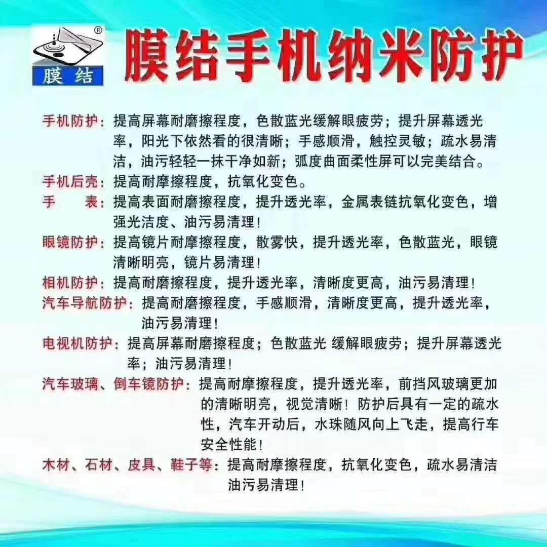 根据以上缺点,天津强宁科技有限公司旗下的膜结手机纳米防护团队,采用国际先进的纳米蓝光阻断技术,手机屏幕是载体。在肉眼下看是平整,可在高倍的显微镜下看屏是凹凸不平的,它能防护在屏的缝隙之处,有效提升它的耐摩擦程度,色散部分蓝光,减少蓝光对眼睛的伤害。在保护手屏幕的同时更重要的是保护眼睛双重防护。提升它的高清度在阳光下看手机依清晰,手感顺滑,触摸灵敏,疏水易清理,轻轻一抹干净如新,不翘边不起泡,弧面曲面柔性屏能完美结合。