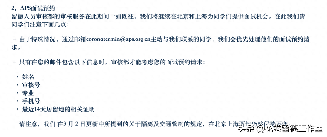 审核部将继续在北京和上海为同学们提供面试机会。但是,由于特殊情况,通过邮箱coronatermin@aps.org.cn主动与我们联系的同学,我们会优先处理他们的面试预约请求。