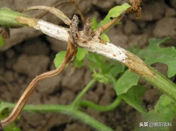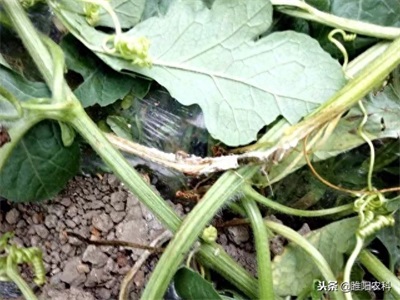 2、茎蔓染病,多发生于茎基部,初生水渍状斑,后扩展成淡褐色大斑,造成茎基部软腐或纵裂,湿度大时病部着生白色絮状菌丝体,导致病茎枯死。