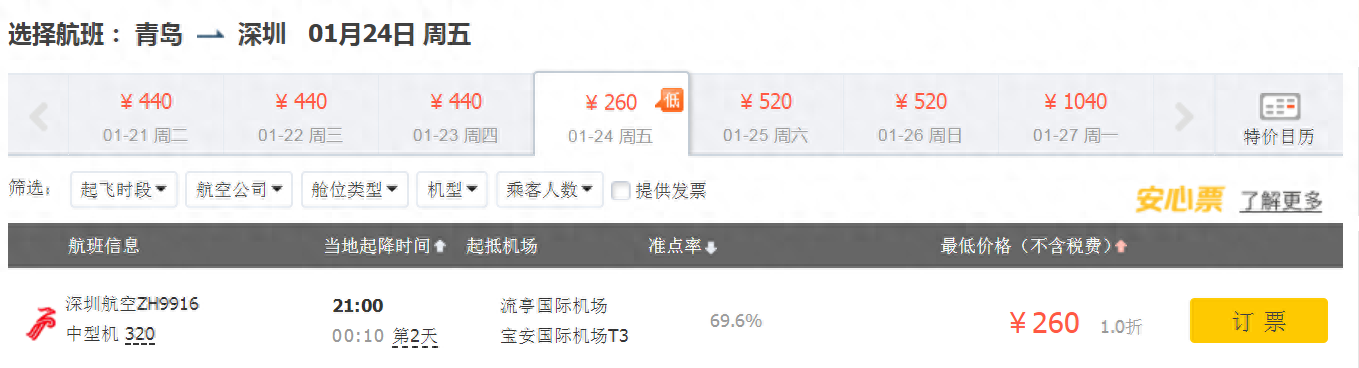 8.青岛--深圳,2025年01月24日21:00出发,次日00:10抵达,特价260元!