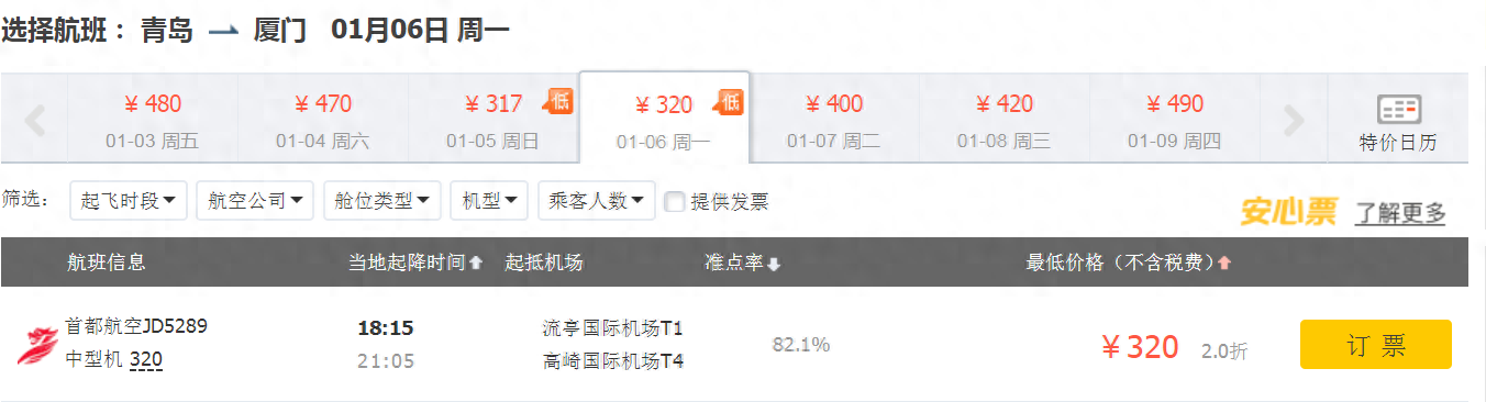 6.青岛--厦门,2025年01月06日18:15出发,21:05抵达,特价320元!