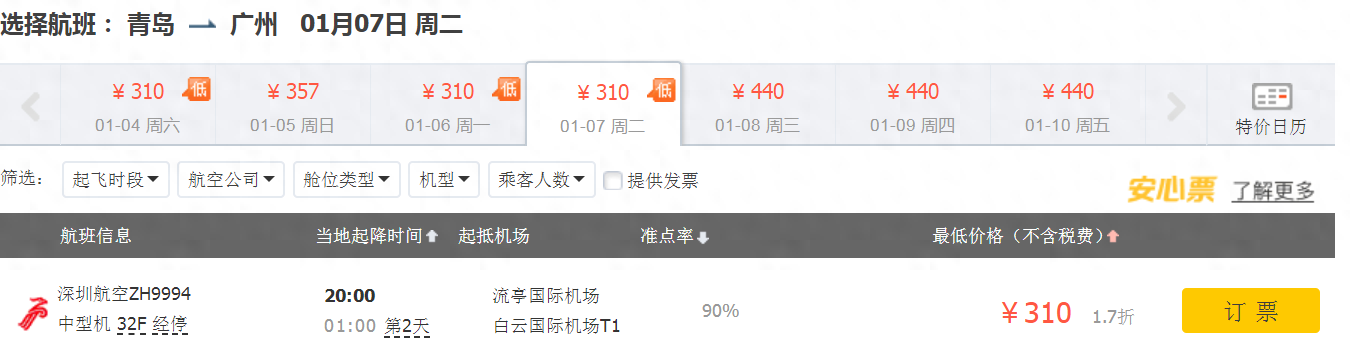 2.青岛--广州,2025年01月07日20:00出发,次日01:00抵达,特价310元!