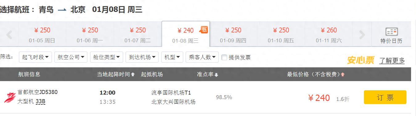 1.青岛--北京,2025年01月08日12:00出发,13:35抵达,特价240元!