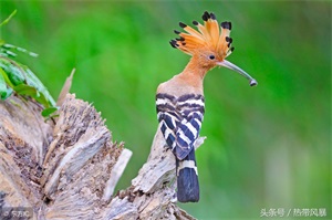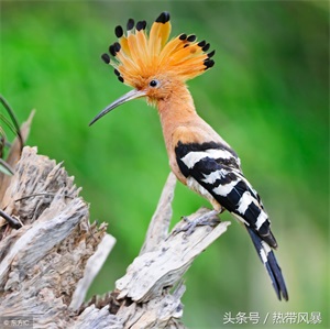戴胜鸟又名胡哱哱、花蒲扇、山和尚、鸡冠鸟等,头顶有醒目的羽冠,平时褶叠倒伏不显,直竖时像一把打开的折扇,随同鸣叫时起时伏,很是奇怪!