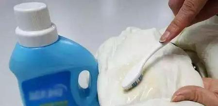 第二步,滴上清洁剂或者洗衣液。静置五分钟。然后用牙刷刷洗。一般刷五到十分钟,油污即可消失。羽绒服不要用手搓!
