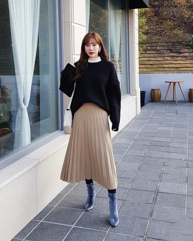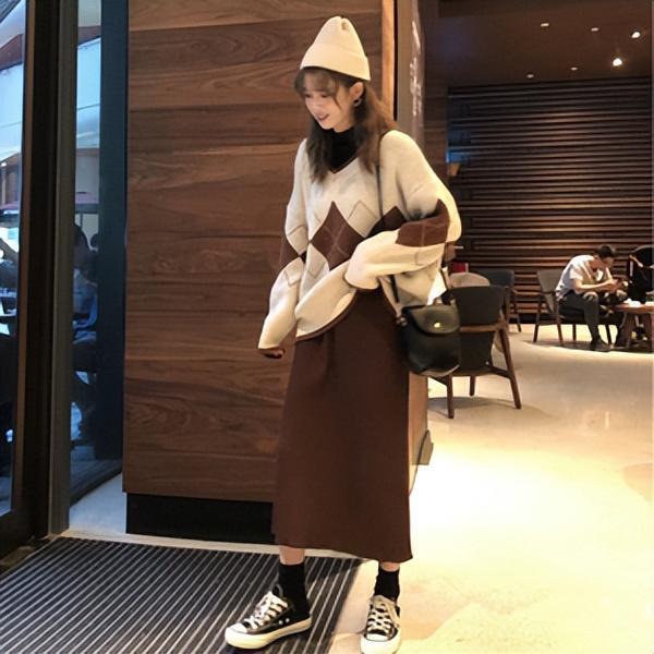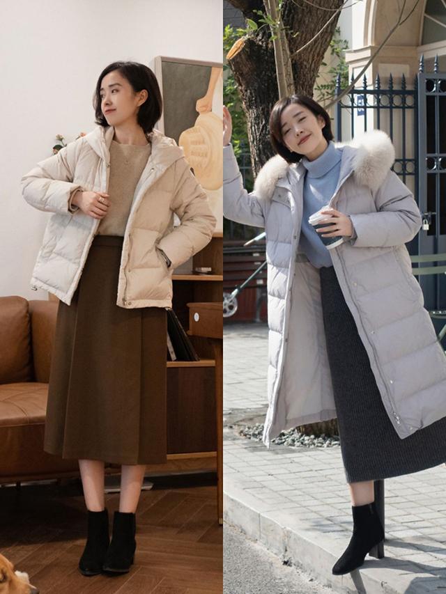 半身裙在搭配上也是很简约的,上面一个简约的毛衣,再加上一个羽绒服,看起来就很保暖,但是还很好看又清新,很是减龄。
