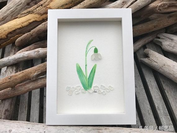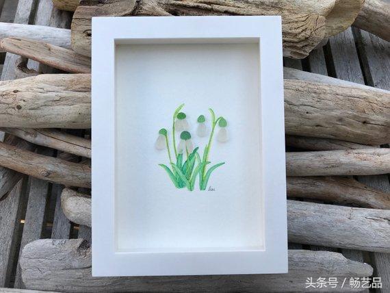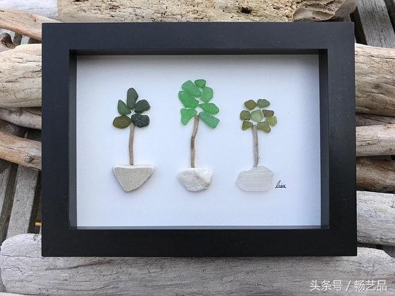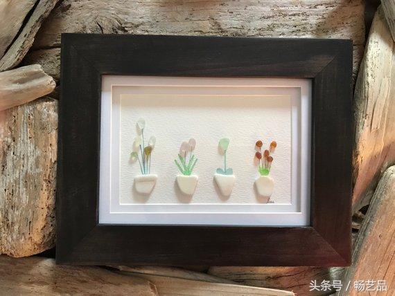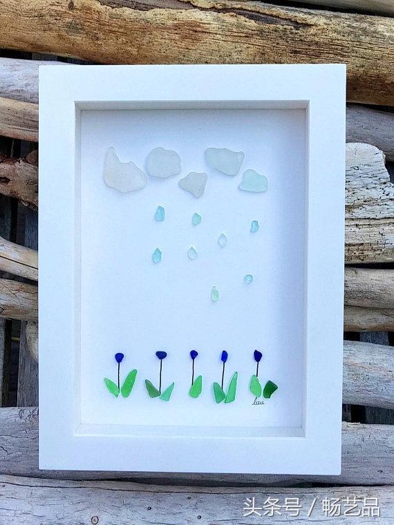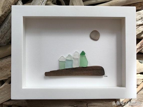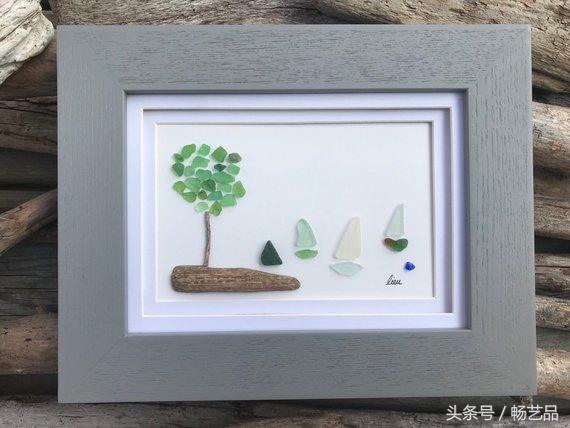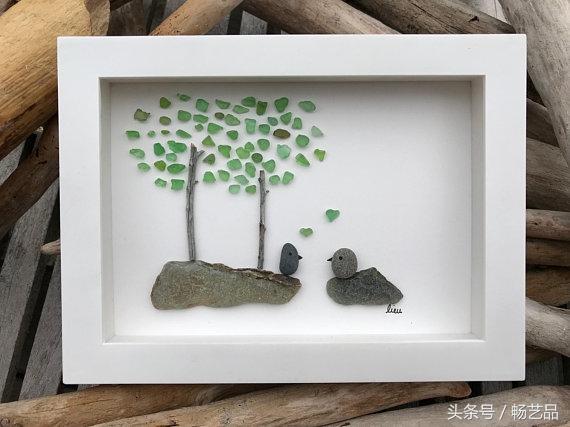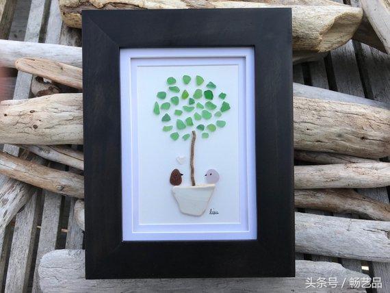 每天都有许多鸟儿来参观我们的花园,我们可以听到他们互相歌唱。这两只鸟找到了同伴,它们仿佛在交流着什么。这是一幅海玻璃艺术品。所有的海玻璃、浮木、海滩卵石和岩石都是在海滩上找来的。因此,每一件作品都是独一无二的,因为这些玻璃和石头都是来自大自然的艺术品,没有经过任何打磨和加工。
