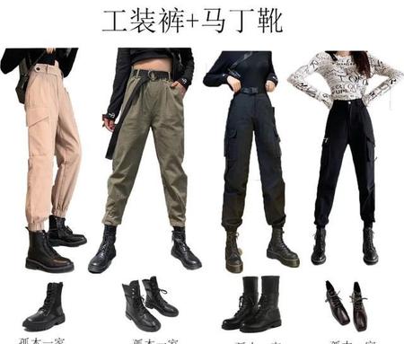 工装裤和马丁靴简直是完美搭配,酷girl本girl了,哈哈。各种颜色都可以搭配的,束脚款下面刚好可以搭配马丁靴。
