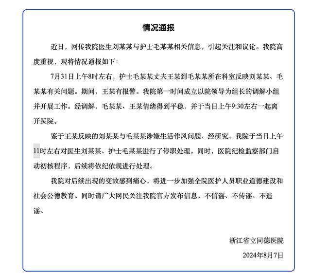 8 月 5 日,浙江杭州一网友发文称,自己儿子向浙江省立同德医院反映护士妻子出轨医生同事后自缢身亡。7 日,院方通报称,已对医生刘某某、护士毛某某进行了停职处理。对后续出现的变故感到痛心,将进一步加强全院医护人员职业道德建设和社会公德教育。