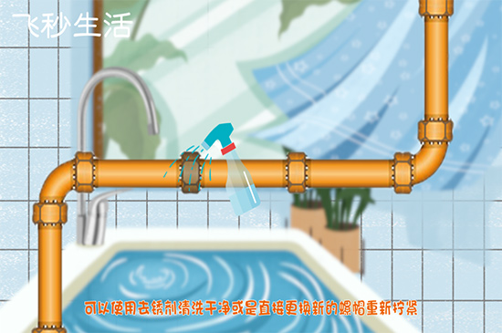 管道接合处出现渗水的现象,可以使用钳子将螺帽松掉,顺时针重新拧紧,对于已经生锈的螺帽,可以使用去锈剂清洗干净或是直接更换新的螺帽重新拧紧,可以有效的防止漏水。