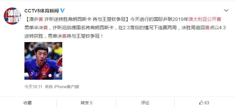 CCTV5体育新闻:【澳乒赛许昕逆转胜弗朗西斯卡将与王楚钦争冠】今天进行的国际乒联2025年澳大利亚公开赛男单半决赛,许昕迎战德国名将弗朗西斯卡,在2:3落后的情况下连赢两局,决胜局追回赛点以4:3逆转获胜,男单决赛将与王楚钦争冠! ??