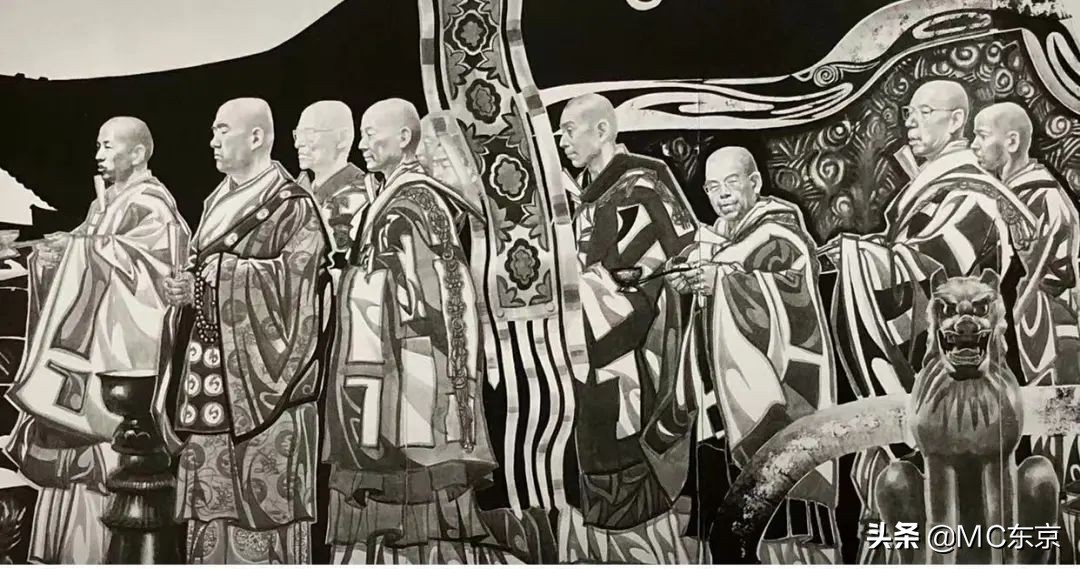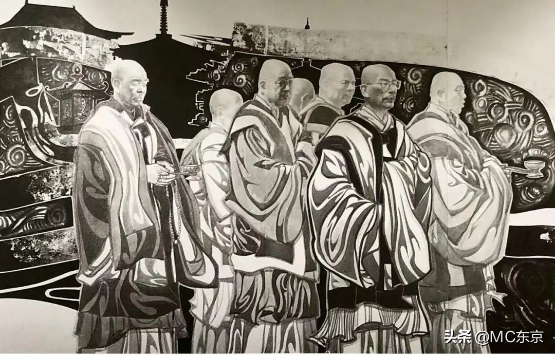 “这部作品的艺术语言的是一幅现代风格的水墨画,整个创作过程经历了6年,那段时间我一直往返于京都和奈良之间,药师寺所有的活动基本都去参加,最长的一次是在药师寺里生活了近一个月,包括给佛像做扫除,晚上冥想、坐禅、学经等,这幅作品里的僧人,每个人的特点,每个人内心,精神上的东西,还有包括他们的服装,我都做了大量的准备工作。”1999年,《圣煌》得以展出,这是药师寺第一次收藏外国画家的作品。不仅如此,此画还一并和药师寺被纳入了世界文化遗产。