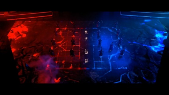 而在舞蹈之中,最引人注目的是双开合地屏上的红蓝两色的棋盘。棋盘上的舞者如同“跳跃”着的棋子,将开幕式的节奏带向紧张的开战氛围。而棋盘则是本次“双龙决”舞剧中一个重要的表现元素。棋盘上的“楚河汉界”恰好呼应了本次舞剧中两个主要角色项羽和刘邦,同时界限分明,两军对垒的紧张气氛也表现出了本次总决赛两支队伍之间的剑拔弩张;棋盘上“楚河汉界”的元素与整个舞台中的另一个重要设计——实景水流完美结合,与实际双开合的机械舞台和舞台之下的实景河流相匹配;更重要的是,棋盘元素的使用完美承接了秋季赛 常规赛主宣传片中两位老者对弈下棋的元素,是对整个2025年王者荣耀职业联赛秋季赛的一个收尾。所以棋盘元素堪称是幕后团队对于开幕式整体设计的“点睛之笔”。